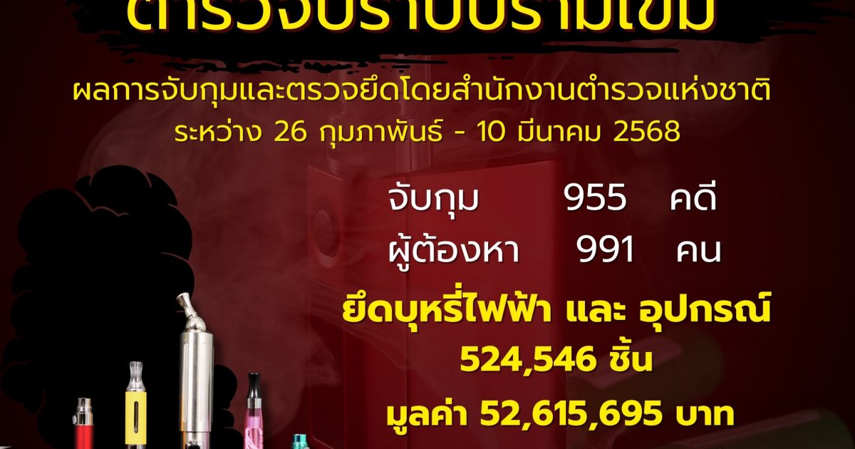 หยุดพิษร้ายจากบุหรี่ไฟฟ้า!!! 17 มีนาคม 2568 by admin / ข้อมูลข่าวสารที่น่าสนใจ หยุดพิษร้ายจากบุหรี่ไฟฟ้า สำนักงานตำรวจแห่งชาติปราบปรามเข้ม จับกุมตรวจยึดอย่างต่อเนื่องกว่า 2 สัปดาห์ ยึดบุหรี่ไฟฟ้าและอุปกรณ์ 524,546 ชิ้น จับกุม 955 คดี ผู้ต้องหา 991 คน แจ้งข้อมูล เบาะแส โทร.1599 สายด่วนสำนักงานตำรวจแห่งชาติ Facebook iconFacebookTwitter iconTwitterLINE iconLine
