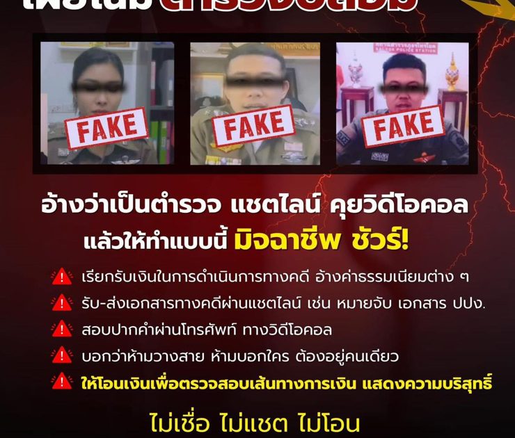 เจอแบบนี้โปรดระวัง เผยโฉม ตำรวจปลอม !!! 3 มกราคม 2568 by admin / ข้อมูลข่าวสารที่น่าสนใจ เจอแบบนี้โปรดระวัง เผยโฉมตำรวจปลอม มุกมิจฯ อ้างเป็นตำรวจ ส่งเอกสารข่มขู่ วิดีโอคอลสอบปากคำทำให้กลัว หลอกให้โอนเงิน จำไว้เสมอเจ้าหน้าที่ตัวจริง “ตรวจสอบเส้นทางการเงินเองได้ ไม่ต้องให้โอนมาตรวจสอบ” Facebook iconFacebookTwitter iconTwitterLINE iconLine