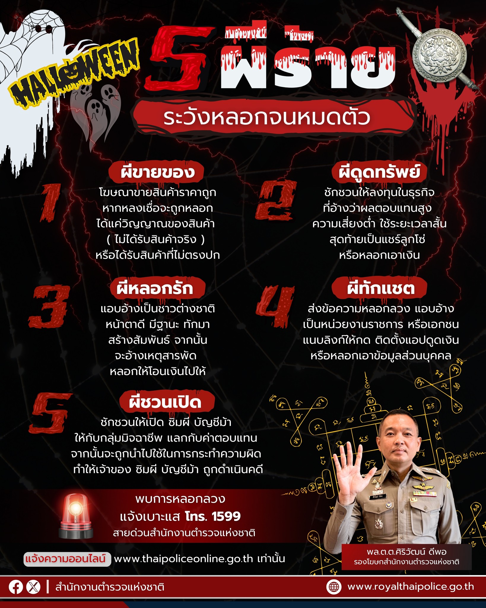 สำนักงานตำรวจแห่งชาติจึงขอเตือนระวังภัย 5 ผี มิจฉาชีพ ที่พี่น้องประชาชนต้องระวัง อย่าให้มาหลอกห