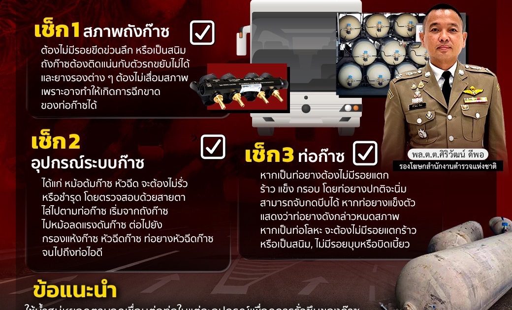 ในส่วนของผู้ใช้รถที่ใช้ก๊าซธรรมชาติเป็นเชื้อเพลิง สำนักงานตำรวจแห่งชาติ ขอแนะนำให้ตรวจสอบสภาพถังและอุปกรณ์ต่าง ๆ ตามวงรอบอยู่เสมอ ได้แก่