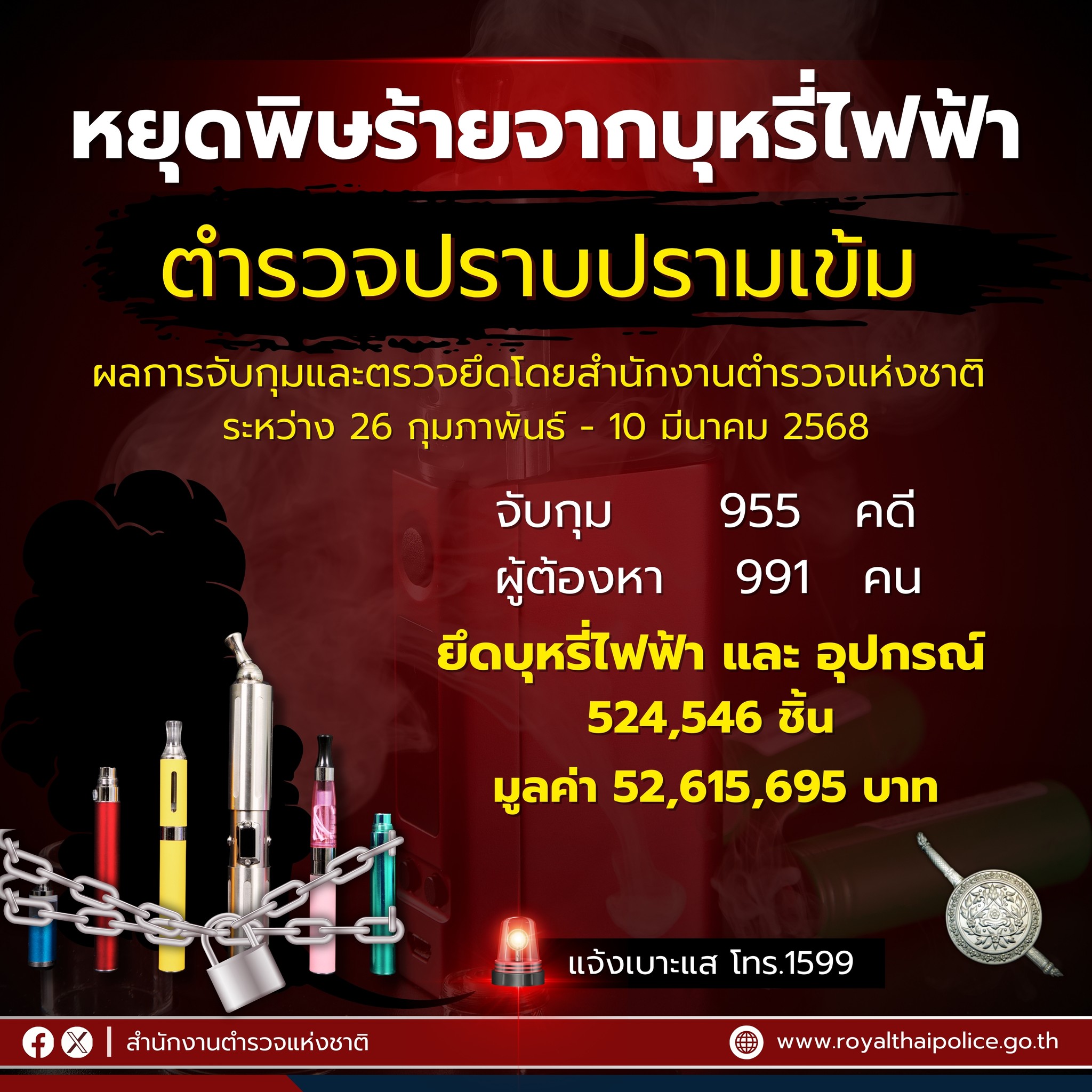 หยุดพิษร้ายจากบุหรี่ไฟฟ้า สำนักงานตำรวจแห่งชาติปราบปรามเข้ม จับกุมตรวจยึดอย่างต่อเนื่องกว่