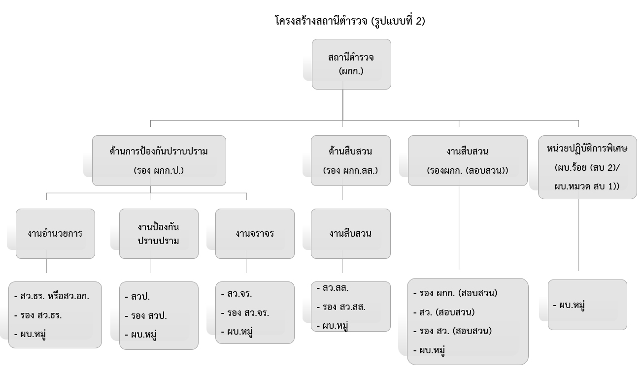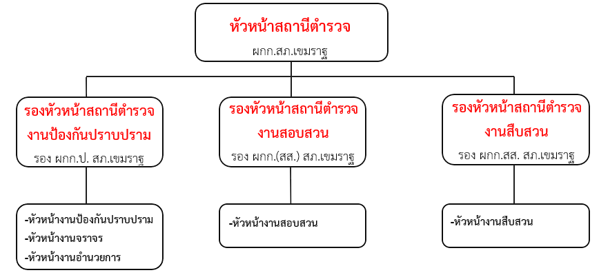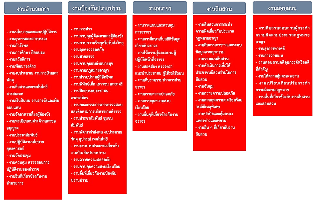 – ลักษณะงานภายในสถานีตำรวจแบ่งเป็น 5 สายงานดังนี้
